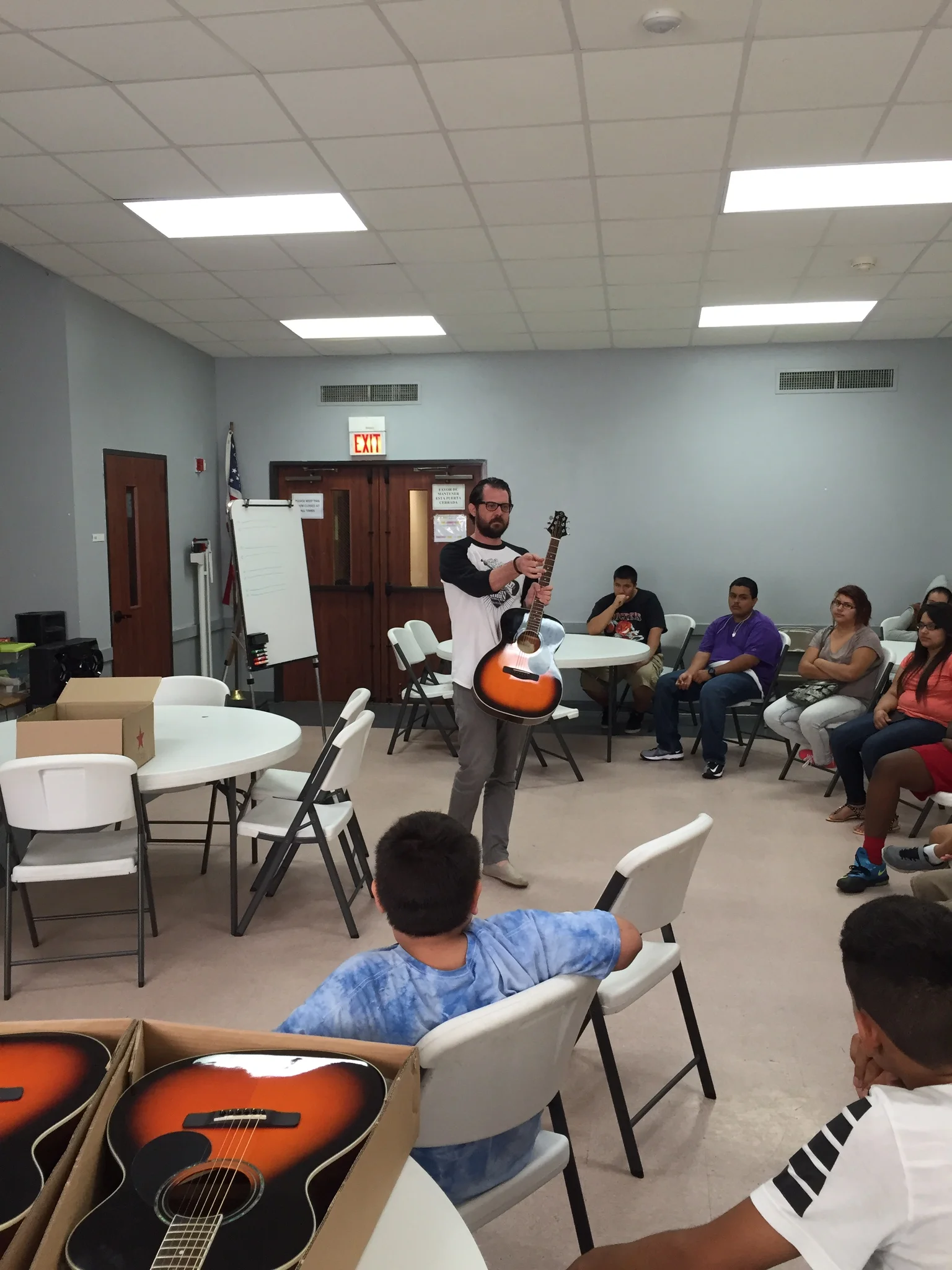 We have 20-24 kids showing up regularly to class every Monday and Wednesday at 1pm. Prior to our first class, most of these students hadn’t ever held a guitar. A week in, many of them were playing through an entire song, start to finish. They’ve been given four songs, so far. Everyone started with “The Eyes of Texas,” (Or “I’ve Been Working on the Railroad,” if you’re Burnt Orange-averse), then moved on to “Ode to Joy,” “Happy Birthday,” and finally, a rock riff that the kids will learn to play over a rhythm chord progression played by Shawn or myself.